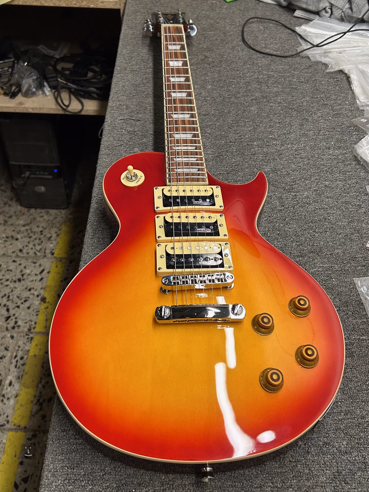 A Vintage V1003CSB egy stílusos elektromos gitár LP single-cut kialakítással a Vintage Reissued Series sorozatból. Hasonlóan a híres amerikai márka egyes Custom/Supreme modelljeihez, három humbuckerrel van felszerelve, mert ahogy a svéd klasszikus mondja: „More is more”. A gitár mahagóni testét faragott, tömör juharfából készült tető és Cherry Sunburst színű bevonat borítja. A kellemes „soft C” profilú mahagóni nyakhoz paliszander fogólap van ragasztva, amelyen huszonkét Medium Jumbo méretű fekvésű fekvésű fekvésű fekvésű fekvésű fekvésű fekvésű fekvésű fekvésű fekvésű fekvésű fekvésű fekvésű fekvésű fekvésű fekvésű fekvésű fekvésű fekvésű fekvésű fekvésű fekvésű fekvésű fekvésű fekvésű fekvésű fekvésű fekvésű fekvésű fekvésű fekvésű fekvésű fekvésű A három Wilkinson humbucker rendkívül zamatos hangzást biztosít a gitárnak, amely agresszív rockos és meleg bluesos is lehet, ugyanakkor szokatlanul széles hangskálát kínál. Az önálló Volume vezérlőkkel lecsökkenthető az egyes hangszedők hangereje, azaz a középső pozícióban, ahol mindhárom humbucker aktív, tetszőleges hangszedő-kombináció állítható be. A beállítások így pontosan az Ön igényeihez igazíthatók. A húrok a GraphTech Nubone nullázóhídon keresztül vannak rögzítve a megbízható Grover hangolókulcsokban és a Wilkinson TOM húrtartóban és húrtartóban. A Vintage elektromos gitárok nagyon vonzó áron kínálnak kiváló kivitelezést és paramétereket, amelyeket sokkal drágább modellekben is megtalálhat. Kiváló választás kezdő gitárosok számára, de hangzásuk és kényelmes játékuk miatt haladó gitárosok is értékelni fogják őket.