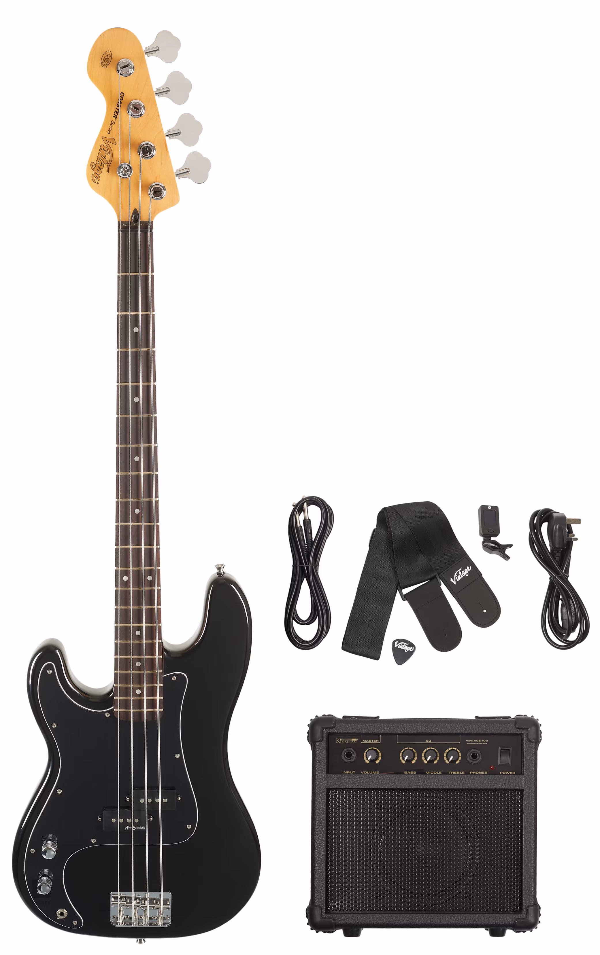 A Vintage Coaster V40 ideális első "komoly" basszusgitárként a rockrajongók számára. Ezt a csomagot olyan játékosok számára tervezték, akik mindent szeretnének, amire szükségük van a játékhoz. A Vintage Coaster Series V40 basszusgitár csomag a basszusgitáron kívül tartalmaz egy pengetőt, szíjat, húrkészletet, tokot, hangszerkábelt, klipszes hangolót és egy 10 W-os Kinsman erősítőt Master Volume hangerővel és 3 sávos EQ-val.