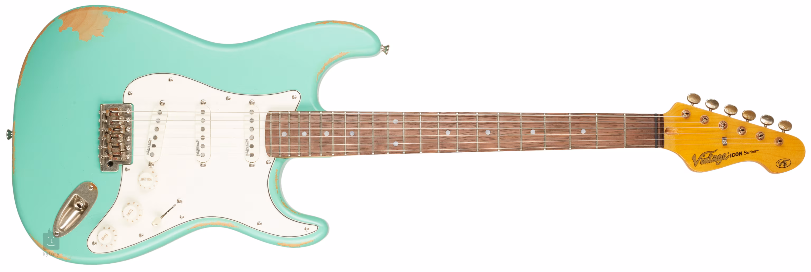 A Vintage márka ICON sorozatú elektromos gitárjai a régóta használt hangszerek kifinomult kialakítását és érzetét kínálják, azaz finomabb és markánsabb mesterséges patinaelemekkel. A Double-cut ST stílusú V6MRVG modell számos harci sebet büszkélkedhet, mint például karcolások, lepattogzott lakk és a hardver minden elemén látható markáns patinaelemek. A gitár teste nyárfából készült. A kellemes „Soft C” profilú juhar nyakhoz 22 db közepes méretű feketerozsdás fogólap van ragasztva. A három Wilkinson single-coil hangszedő Alnico V mágnesekkel biztosítja a gitárnak az ST modellek autentikus hangzását. A középső, fordított polaritású és tekercselt hangszedő a 2. és 4. pozícióban elnyomja a single-coil hangszedők jellegzetes zaját. A hang karakterét a szokásos vezérlőkkel állíthatja be. A húrok a szabadalmaztatott Wilkinson E-Z-Lok zárható mechanikákban és a 6 pontos Wilkinson tremolóban vannak rögzítve, acél nyereggel. A Vintage elektromos gitárok nagyon vonzó áron kínálnak kiváló kivitelezést és paramétereket, amelyeket sokkal drágább modellekben is megtalálhat. Ezek a hangszerek nagyon jól szólnak, és megjelenésükkel sem okoznak csalódást. Kiváló választás kezdő gitárosok számára, de hangzásuk és kényelmes játékuk miatt haladó gitárosok is értékelni fogják őket.