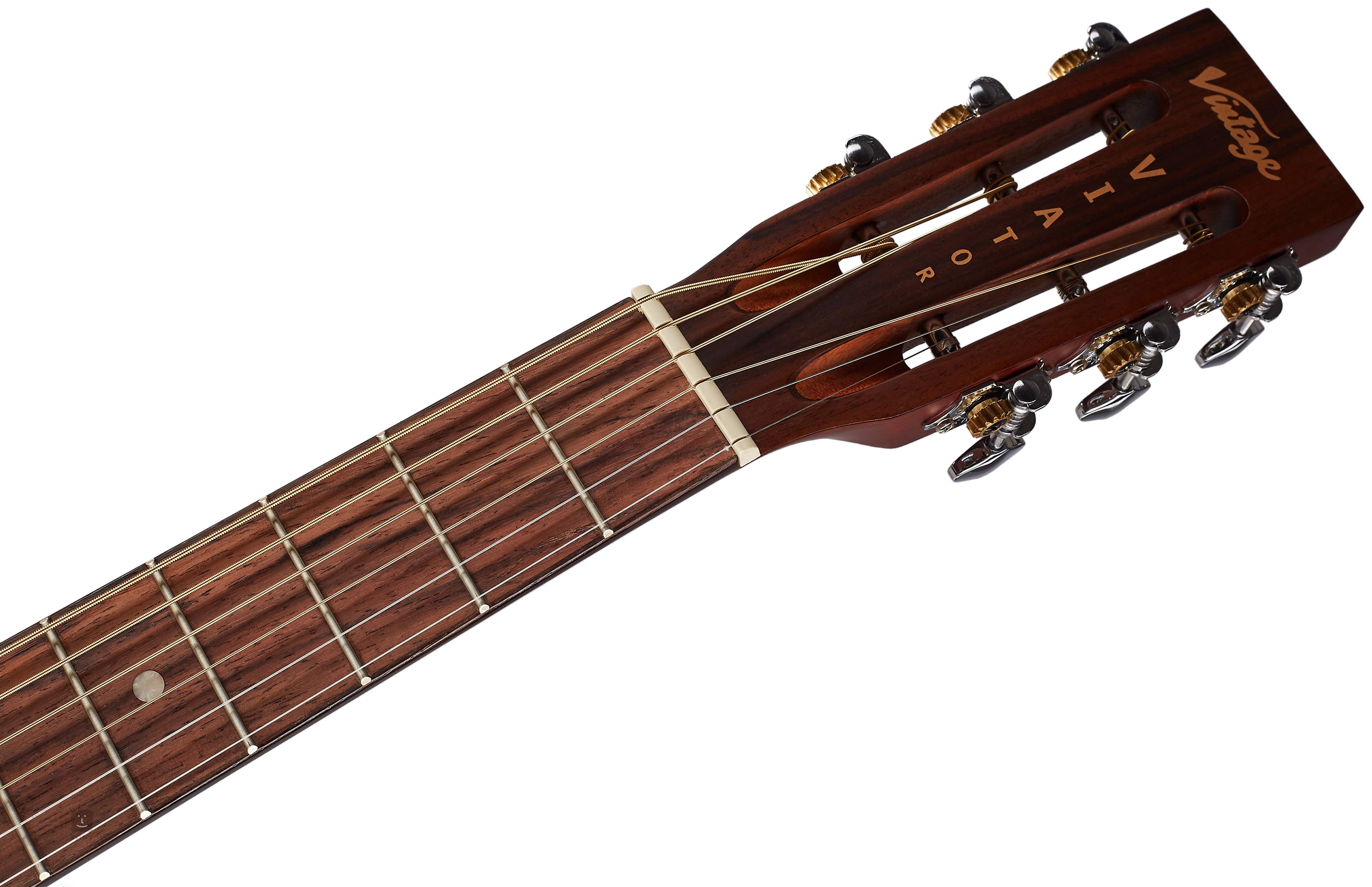 A stabil hangolást a NuBone szintetikus csontnyereggel ellátott rózsafa fogólap biztosítja. Ugyanebből az anyagból készült a nulla bund is, a nyitott hangolómechanizmusok a Grovertől származnak, és a nagyszerű funkcionalitás mellett fényűző krómozott kivitelben is meglepnek. A gitár egy Vintage logóval ellátott, párnázott tokban érkezik.