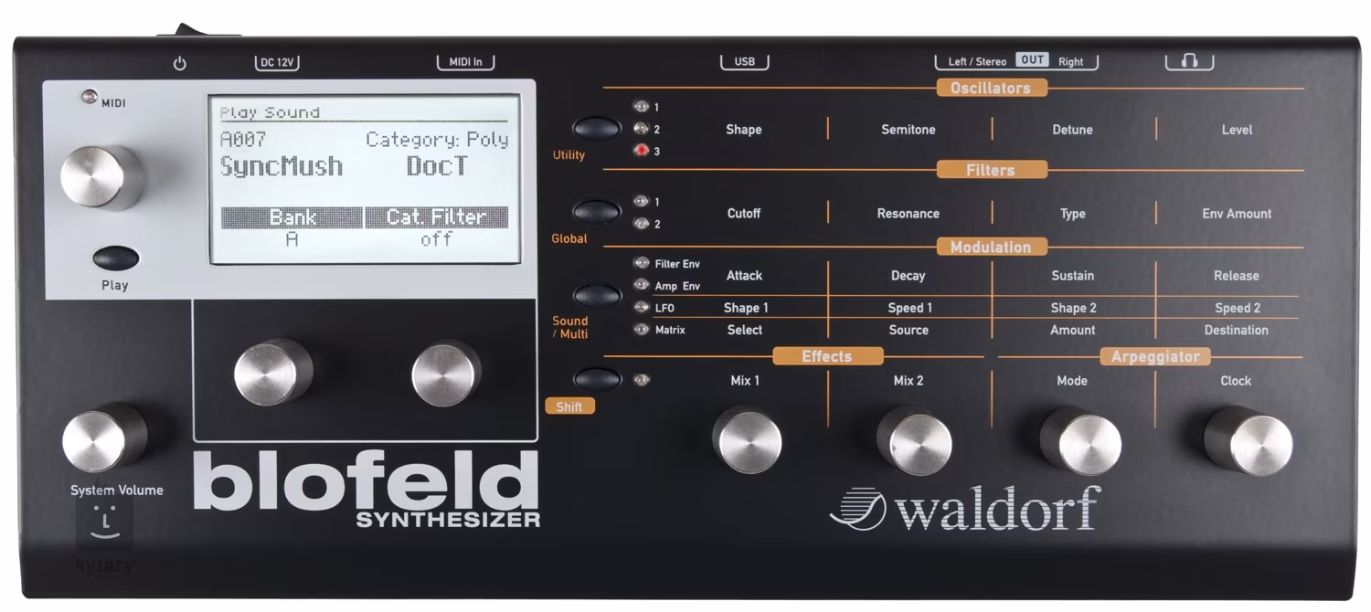 A Blofeld black ugyanolyan vastag, gazdag hangzással rendelkezik, mint más népszerű Waldorf hangszerek, például a Q, Q+, MicroQ, MicroWave és a zászlóshajó Wave. De a Blofeld black nem csak a Q sorozatú szintetizátorokból ismert organikus analóg hangokat képes előállítani (sőt, a MicroQ összes hangját képes betölteni), hanem tartalmaz egy Wavetable motort is.