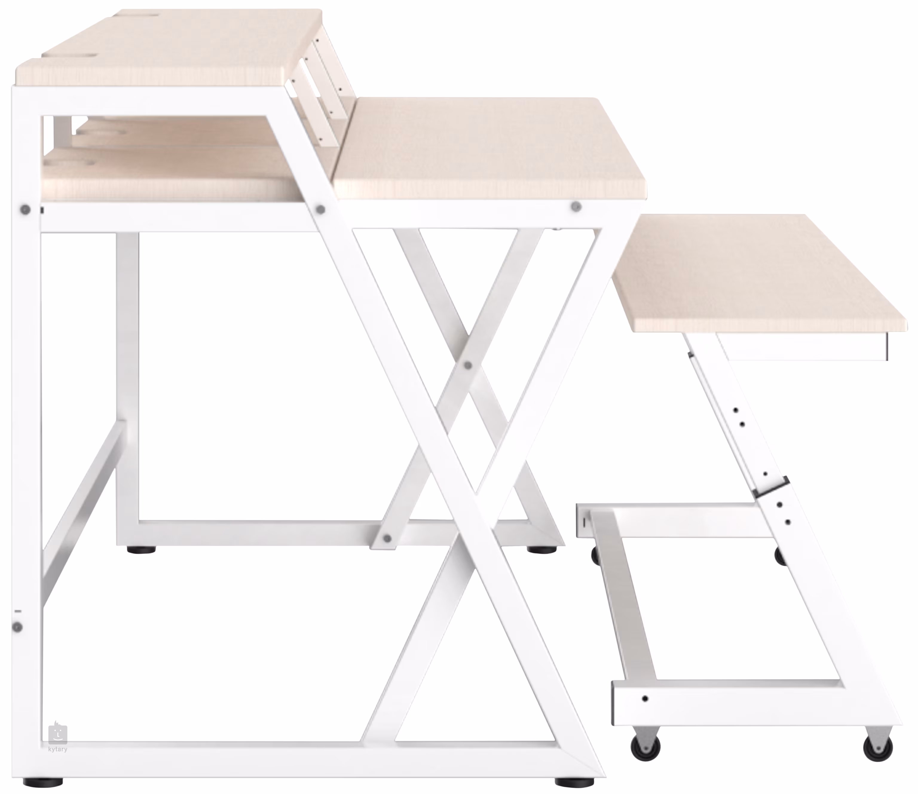A felső polc bőséges helyet biztosít egy nagy LCD monitor és egy pár hallgató monitor számára, amelyek a 90 cm magasan lévő talapzatnak köszönhetően ideális sweet spotot alkotnak. A középső rész 3x 3U pozícióval a legfontosabb rack-berendezéseidnek van fenntartva, a középső rack-részbe pedig a mellékelt fa töltőelemet szerelheted be, hogy a rack-hely helyett más berendezések tárolására is bővítsd a lehetőségeket. A masszív, 146 cm hosszú főtábla 75 cm magasan van rögzítve, míg a görgőkön álló kihúzható asztal, amely akár a legszélesebb, 135 cm széles billentyűs hangszerek számára is alkalmas, 51,5 és 61,25 cm között állítható magasságú.