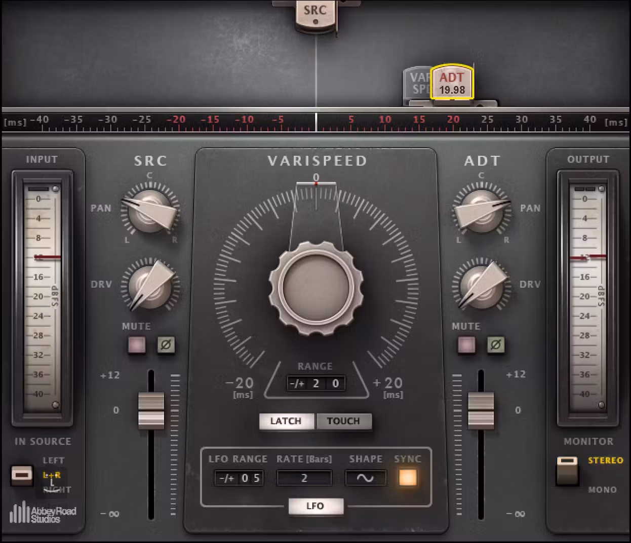 Szalagos vokáldublőr A Reel ADT az egyetlen olyan plugin, amely hiteles Artificial Double Tracking effektust biztosít, amely a legendás Abbey Road hangmérnök, Ken Townsend által John Lennon és a Beatles felvételi igényeihez létrehozott szalagos késleltetésen alapul. Sok modern duplázó effekt egyszerűen csak késlelteti a hangot az eredeti sávhoz képest, de az ADT technológiával a duplázott hang néha megelőzte a referenciasávot, néha pedig késleltetett, az állandó ingadozás pedig gazdagabbá és ritmikailag érdekesebbé teszi a duplázó hatást. A Reel ADT mélységet kölcsönöz ennek az eredeti hatásnak. A két modellezett szalagos magnó (forrás és duplázó), amelyek mindegyike külön telítettségi, wow & flutter beállításokat, hangmagasság-ingadozást és egyebeket biztosít, a Reel ADT olyan benyomást kelt, mintha két igazán különálló vokálsávot hoznának létre egyetlen forrásból.