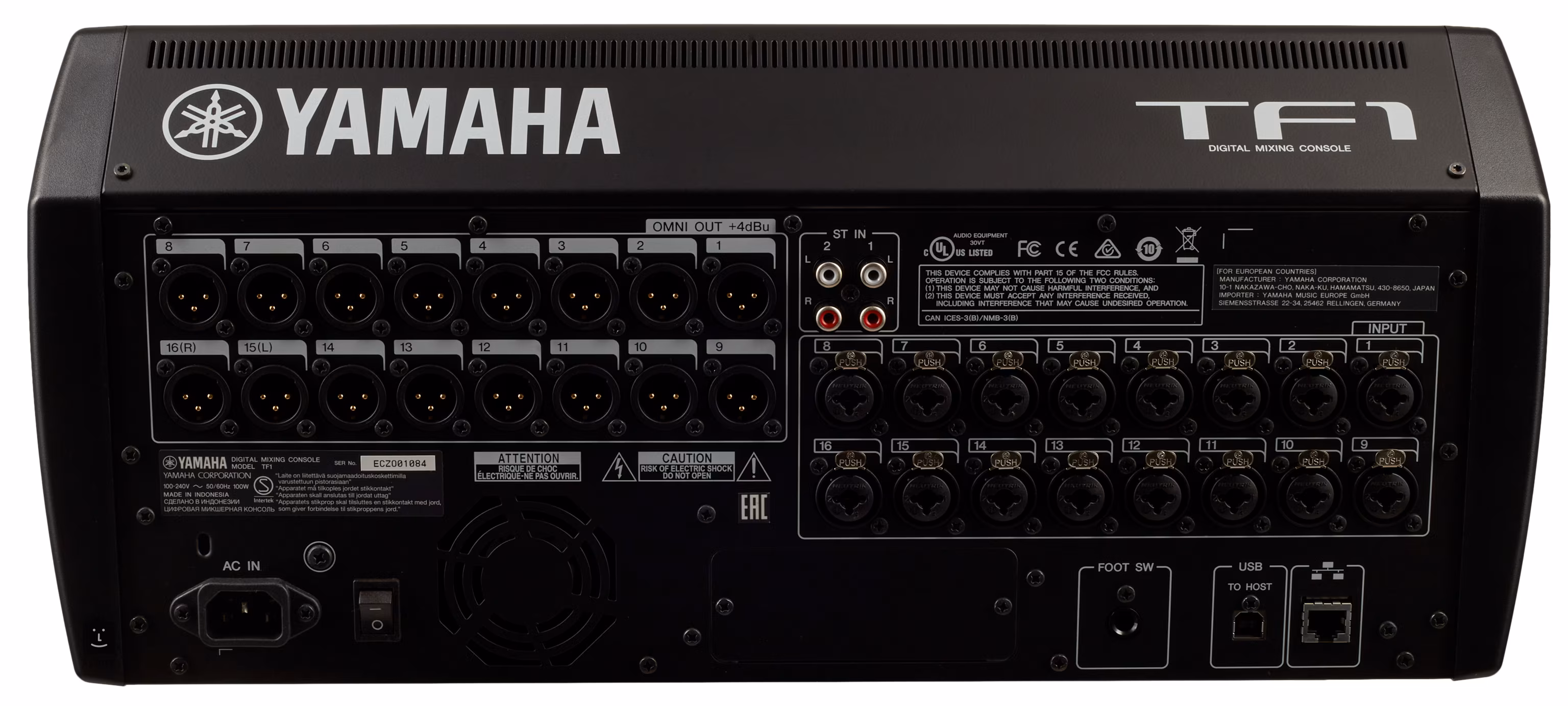 A Yamaha TF-1 a sorozat legkisebb keverőpultja. Ez 17 motoros fadert, 16 analóg bemenetet és kimenetet, a TF konzolok összes funkcióját kínálja, és a könnyű szállítás érdekében rackbe szerelhető. Egy NY64-D kártya számára bővítőhely is található rajta.