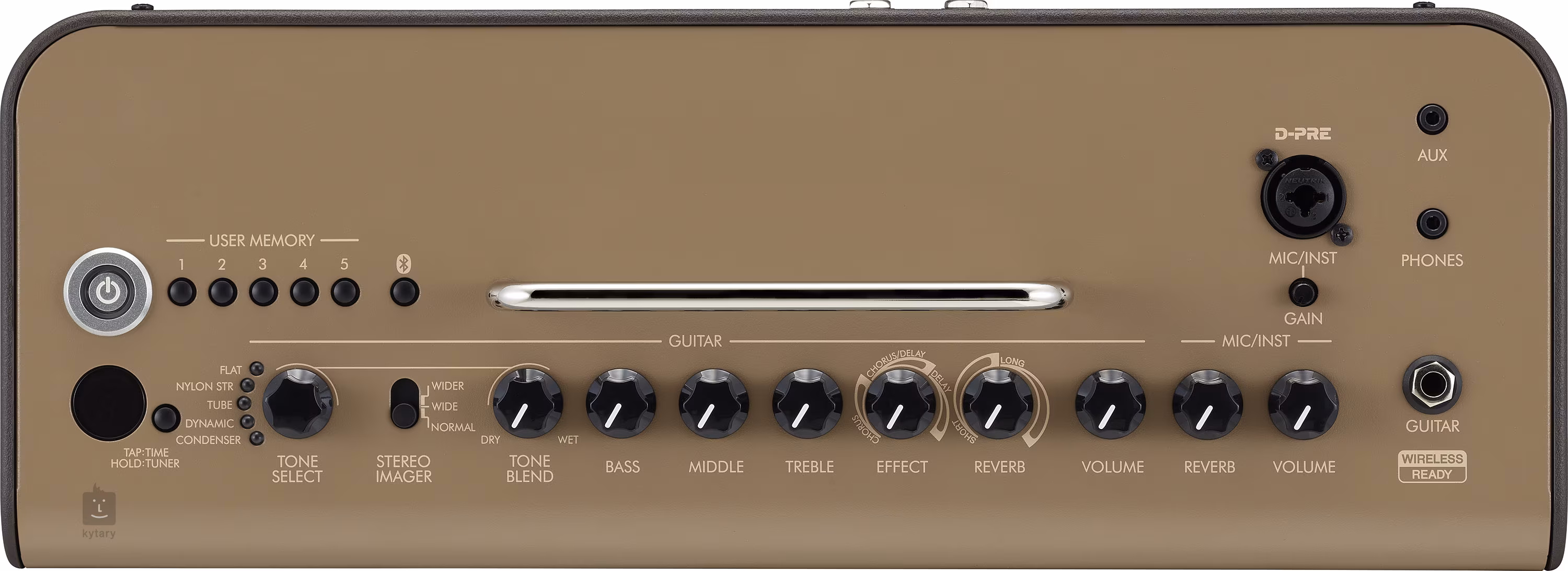 Tone Select, Stereo Imager, Tone Blend, Bass, Middle, Treble, Effect, Reverb, Volume, Mic/Inst Reverb, Mic/Inst Volume, Mic/Inst Gain, 5x User Memory switch, Tap/Tuner switch