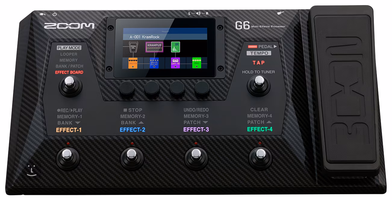 A Zoom G6 a Zoom gitár multieffekt családjának újabb tagja. A Zoom legendás gitáreffektjeinek széles választékát tartalmazza négy kategóriába rendezve (DYNMCS/FILTER , DRIVE, MOD, DELAY/REVERB), Zoom virtuális gépmodelleket a hagyományos skálán a vintage és blues/rock klasszikusoktól a modern prog metal/djent hangokig, 70 pontosan rögzített impulzusválasz (IR) gitárkabinetet (több mint 20 kabint, mindegyik három különböző mikrofonbeállítással rögzítve), hely több mint száz egyéni IR rögzítésére, integrált expressziós pedál, 68 nagyszerű hangzású dobminta, és egy looper 45 másodperces felvételi idővel (SD-kártyával a kapacitás két órára nő, és akár 256 loop is létrehozható és tárolható).